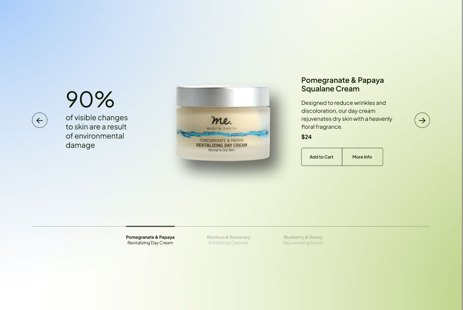 Mudita Earth came to me with an existing line of natural skincare products and a packaging problem. The labels were generic — flat, interchangeable, forgettable in a category where shelf presence is the first conversion point. More critically, the brand's core differentiator — its naturally derived, food-grade ingredients — was invisible on pack. The formulations were genuinely distinctive, but the packaging wasn't doing any of the selling.